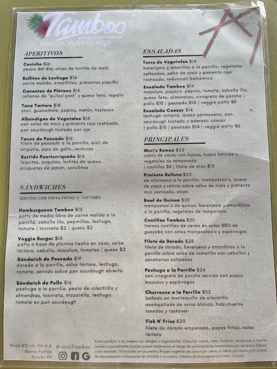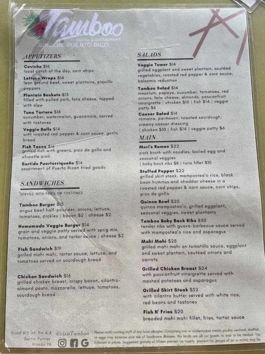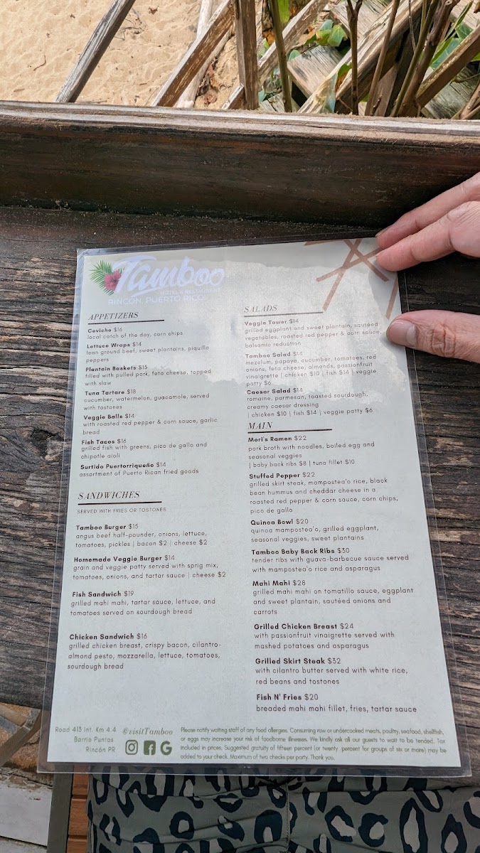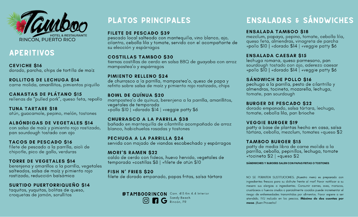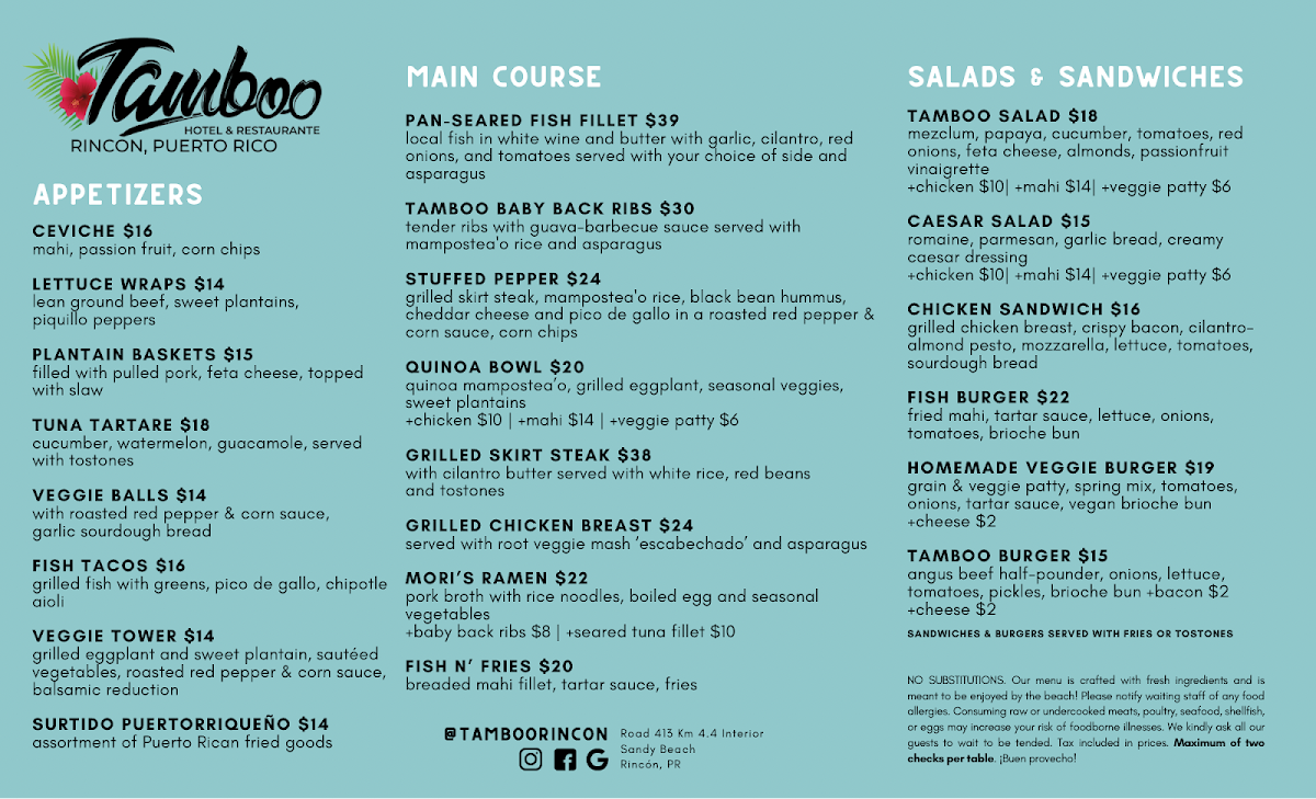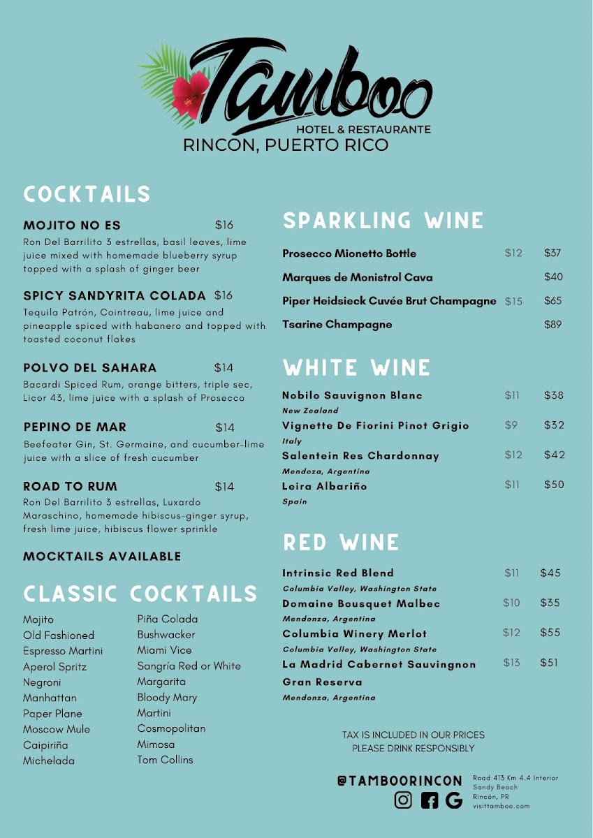 Welcome to Tamboo, located on the stunning beachfront of Carretera 413 Ramal in Rincon, Puerto Rico. This restaurant offers a menu that reflects the essence of Caribbean cuisine, accentuated by fresh, vibrant ingredients and expertly crafted dishes. The atmosphere is serene and cozy, making it the perfect spot to enjoy a meal as you watch the sun dip below the horizon.